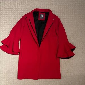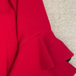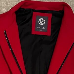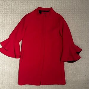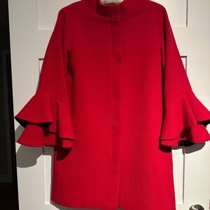Beautiful fall/winter dress coat. Brilliant red colour, zipper closure, snap at top of zipper. Flouncy sleeves, length falls just above the knee. Canadian company Ellabee.