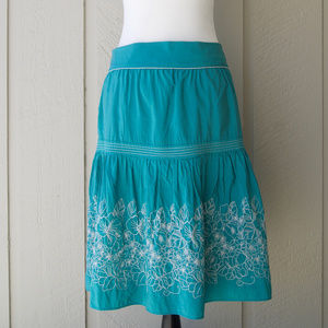 Light-weight, very cute, Boho Chic, knee-length, lined ELLE skirt in turquoise blue and white embroidery. Gently used in good condition, - no holes, rips or stains. The garment label is in chinese so I've done my best to describe the item below.