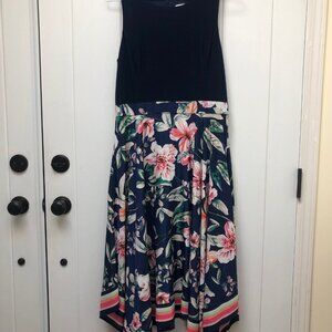 Elle. Asymmetrical Dress. Blue with beautiful floral pattern on bottom. Sleeveless. Zip back. Size L
