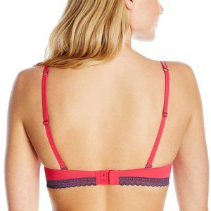 Ultra chic, the Elle Macpherson Intimates Ultrafines Contour Plunge Bra has smooth cups trimmed with lace. Styled with scalloped edging, this supersoft underwired bra features adjustable and convertible straps and secures with a two hook and eye fastening. Straps have a fun cutout detail. Colour is a vibrant red with a purple-silver lace trim. Light shaping padding. In EUC, no real flaws but straps seem long while still being very springy. Size 32DD.