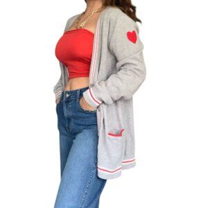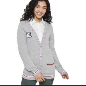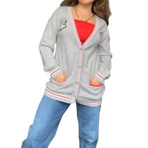 Tags:cardigan, casual wear, preppy style, comfortable, versatile, medium fit, small tag, office outfit, cozy look, functional pockets, cute details, red heart, dog patch, soft knit, layering piece, relaxed style, everyday fashion.