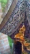 Ellen Tracy V. G. Condition, silk scarf featuring gold, browns , and purples. Square 34x33. Outdoor pix really bring out the vibrant, rich bluish- purple inner section colours. What’s nice is that this scarf can be folded and turned to present a wide array of “looks” and colour combos.