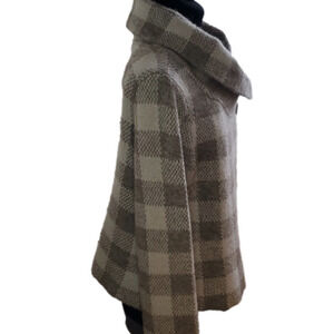 Ellen Tracy shawl collar sweater jacket combines comfort and style with its acrylic, poly, wool, and spandex blend, offering warmth in a checkered taupe pattern.