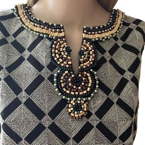 Ellen Tracy Shift Dress Tribal Beaded Boho Woven Geometric Linen Cotton Blend