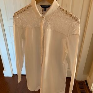 This shirt is beautiful. Lace on the shoulder and back. It goes great with leather leggings or little black skirt. It is size Medium, has only been worn a few times. Fits like a 8 to 10 .