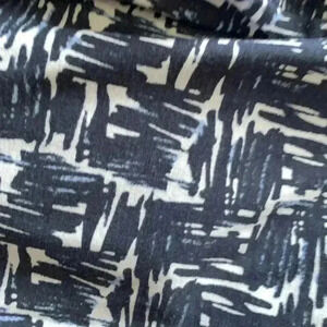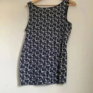 This top has a nice blue white pattern with black trim around the neckline and armholes. Excellent used condition.
