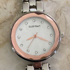 Beautiful Ellen Tracy watch, featuring a clean stainless steel band and stunning dial, white with Crystal hour markers, multi faceted crystal face in soft pink and matching pink hands.