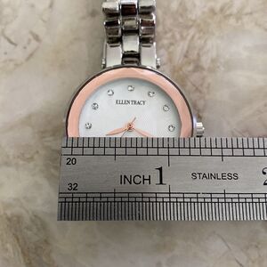 Beautiful Ellen Tracy watch, featuring a clean stainless steel band and stunning dial, white with Crystal hour markers, multi faceted crystal face in soft pink and matching pink hands.