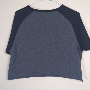 really cute cropped t-shirt. with baseball style sleeves. embroidered patch large logo across the front. UK medium. length 17. pit to pits 19.