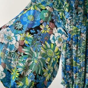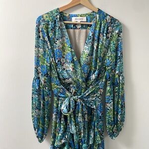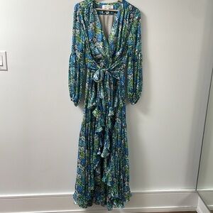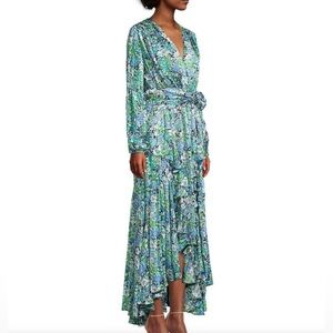 Elliatt Revolve Claude Ruffled Satin Maxi Dress Floral High Low hem Blue Small S