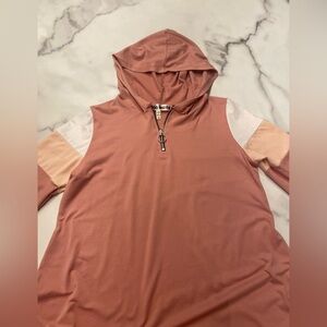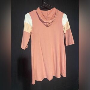 Ellie Belle girls, pinky salmon hoodie, dress with three-quarter length sleeves and a partial front zip up. The sleeve is cream, peach and a pinky salmon color. This is a jersey knit dress very cozy. Great for back to school. It is 96% polyester and 4% spandex.