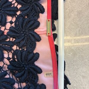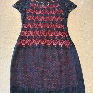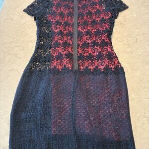 One of my favorite dresses or all time. Dark blue lace top dress with hot pink silk camosile under dress. They are not attached. Above the knee length. There is a 0.5 cm tear in the pink camosile that is complete hidden when wearing overlay.