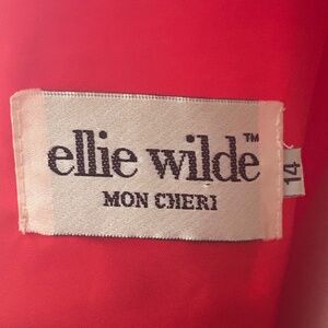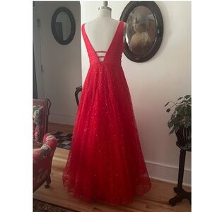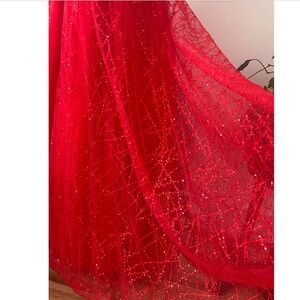 An Ellie Wild Mon Cheri red tulle skirt beaded evening gown with a deep v neckline and mesh panels. The condition is very good, there is some fraying to the hem, and a few beads lost. The back straps hook shut and the rest of the skirt zips up.