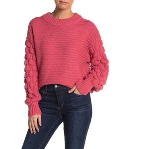 A plush knit sweater with unique bubble sleeves offer a cozy chic attire.