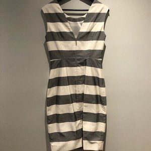 Pale-grey and white stripes pattern a crisp sleeveless dress woven from a lustrous blend of mulberry silk and cotton. The plunging V-back gives an alluring and unexpected twist to the classic sheath silhouette.