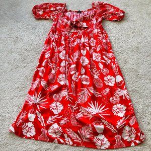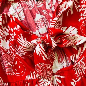 Red and white floral tie front full skirted maxi dress has waist seam with back elastic, elbow length sleeves, elasticized gathered neckline which can be worn off or on the shoulders.