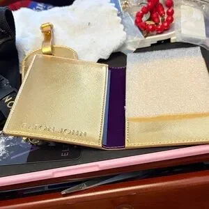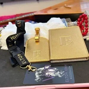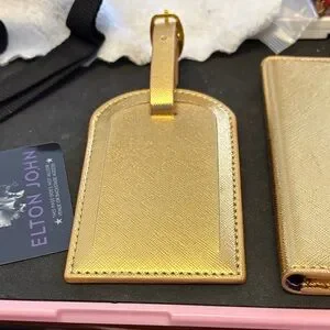 Elevate your style with the Elton John Gold Accessory Set. This elegant collection features a gold luggage tag and passport holder, perfect for the sophisticated traveler.