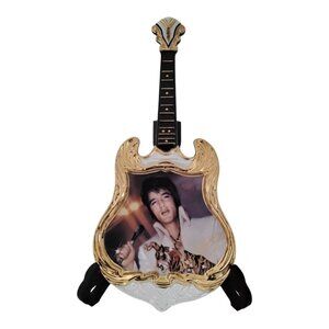 Need a gift for the fan of Elvis or are you a collector of Elvis memorabilia? This just might be it! This is a Bradex Ceramic Guitar-Shaped Plate #B02915 in the Limited Edition of "1974, The Superstar"; third issue in the Elvis Presley: Entertainer of the Century collection. It is Plate 84-B11-173.3 from The Bradford Exchange in 2000. It is 12.5 inches (32 cm) long and 6 inches (15 cm) wide. There is a metal hook for hanging. It is in excellent condition - no cracks, crazing, chips, or missing paint. It has the TCB trademark on the handle, and 22K gold trim. His signature is in gold paint.