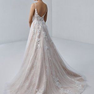 The romantic Chloé gown features subtle 3D floral details, hand-beaded slim straps, and a full Chantilly lace underlayer for a multidimensional, gorgeous look.