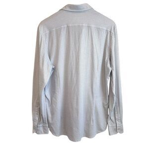 In excellent condition. Emanuel Berg Modern Fit shirt. This shirt is in a jersey material with a soft cotton blended with elastane for some stretch. Long sleeve button down with a white background and blue small star print. Size Medium / Large or 16 neck. This is the perfect business casual shirt. Flat lay measurements: 22" pit to pit, 29" length.