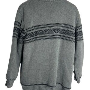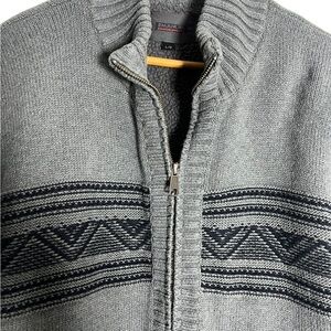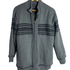 Elevate your look with this stylish zip-up sweater. Features a sleek gray design with black patterns. Ideal for layering.
