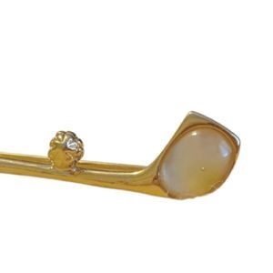 Gold coloured club brooch with pearlized enamel stone at base of club and bright small crystals on handle.