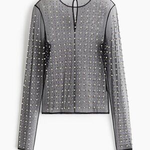 Top in sheer mesh embellished with rhinestones and pearlescent beads. Round neckline, keyhole opening at back of neck with a pearlescent bead, and long sleeves. Unlined.