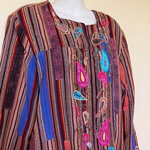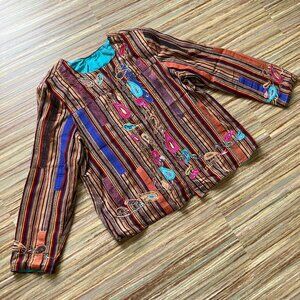 Unique & colorful lightweight cotton jacket has multicolor striped outer fabric with patchwork, applique, bead & sequin embellishments. Lined in bright blue fabric. Front of jacket has hook & eye closures. No tags - fits like a women's "Large" - see below for garment measurements. Hand wash or dry clean recommended due to embellishments. Pre-owned condition: a few of the hook/eye closures have been replaced with new ones.