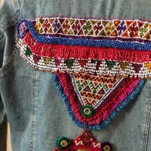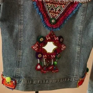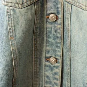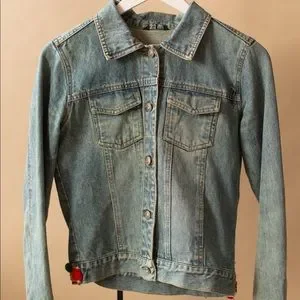 Worn once for pictures, purchased in Spain in a curated boutique for 200$. Gorgeous fitted denim jacket. The size is not mentioned but I would definitely think this is an extra small or small. I usually wear XS and the size is perfect on me (slightly loose but not too much)