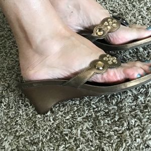 Super cute bronze embellished slip on sandals. Wedge Heel is about 1.5” high Size 7 wide. Like new.