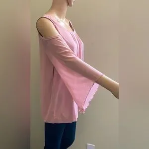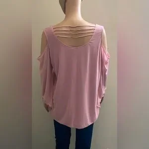 Dusty Rose Cold Shoulder Top. Gold Elongated Bead Detail on Upper Back. Sheer Sleeves. Fully Lined Bodice. Elastic at Hem.