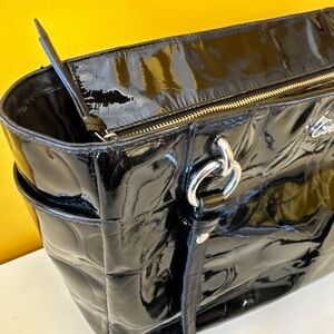 This bag is in good used condition. There are signs of ware on the corners, and in lining, handles as well. As seen in photos. This is a black, patent leather monogrammed coach bag. Price reflects condition of bag. Being sold as is.