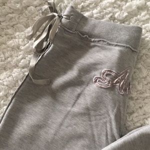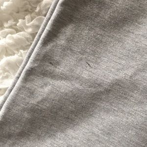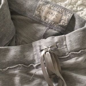 Really pretty light gray joggers with silver ribbon hip ties (used as drawstring to tighten/loosen)
