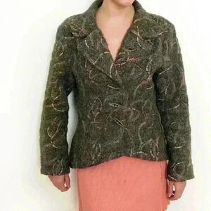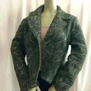 This is a beautiful, rare-find blazer by a French Canadian designer. The blazer features a fitted waist with a rounded hem for a flattering silhouette and a notched lapel with cropped shape. Curvy abstract pattern embroidery in peach, blue and ecru tones on green boiled wool type fabric. Front closure accented with three elongated oval metallic buttons. Truly gorgeous unique piece!