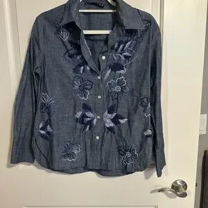 Chic denim shirt in dark wash with embroidery. Perfect for casual wear.
