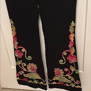 Stylish unique black pants featuring vibrant floral embroidery. Perfect for adding a pop of color to your wardrobe. Featuring intricate sequin embellishments. Ideal for elevating your style.