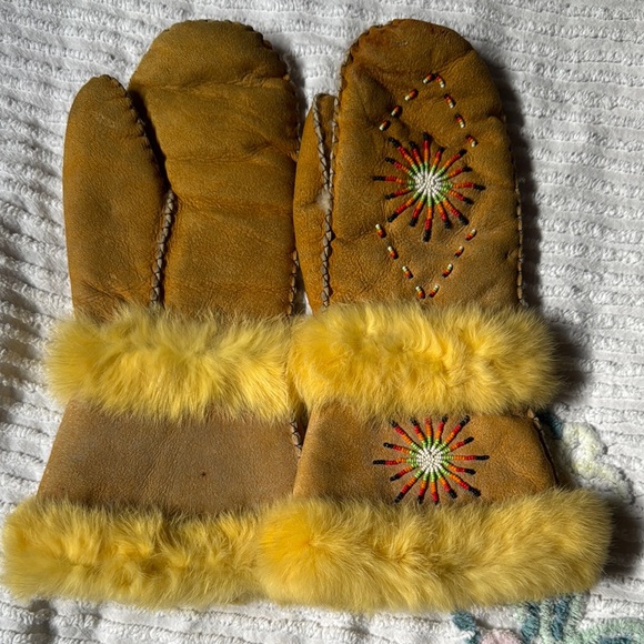 Embroidered Deer Skin Mittens with Yellow Fur Trim