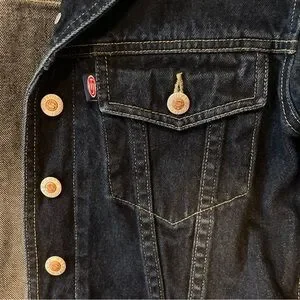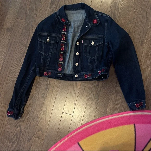 Stylish denim jacket with floral embroidery. Features button closure and pockets.