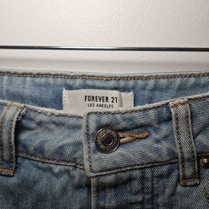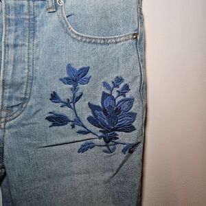High-waist jeans from Forever21, featuring a button fly and blue floral embroidery.