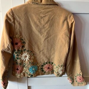 Chic tan jean jacket with colorful floral embroidery. Ideal for a stylish look.