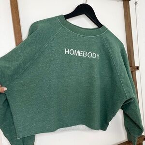 GAP oversized cropped green sweatshirt with white ‘HOMEBODY’ embroidered text done by me. Embroidering stabilizer on the back is misaligned, not really visible from the outside but the sweater has been priced accordingly (pictured).