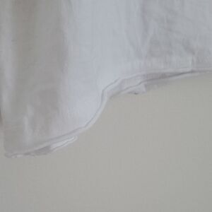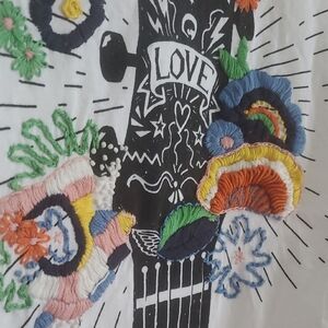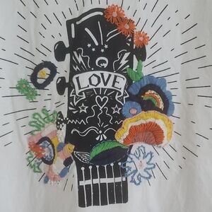 Tee featuring guitar print surrounded by embroidered flowers. Raw hems. In good condition. Size L.
