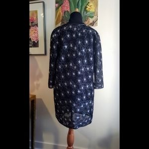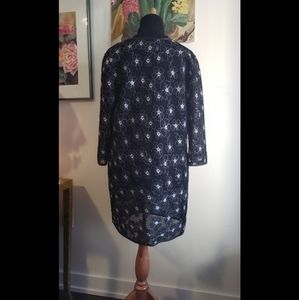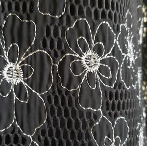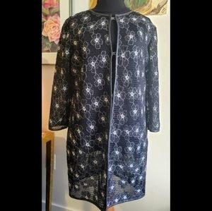 Stunning white and black laser cut jacket with an embroidered floral detail, 3/4 sleeves and an open front with clasp option to close.