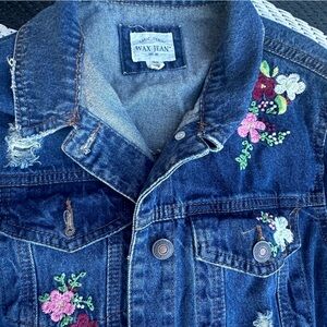 Vintage looking blue jean jacket with distressing on it and floral embroidery. Like new condition! Could fit up to a medium.