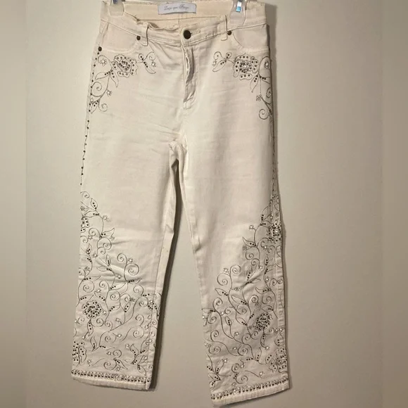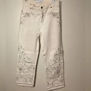 Light beige jeans with embroidered embellishments. Size 42 BR / 06 US. Ankle length, straight cut, mid waist rise. 27" waist