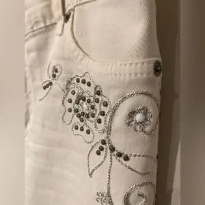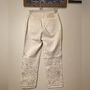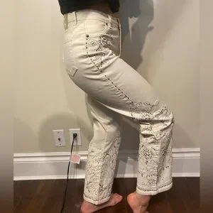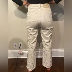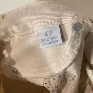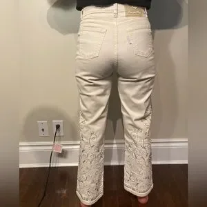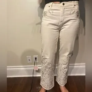 Jean beige clair avec des ornements brodés. Taille 42 BR / 06 US. Longueur cheville, coupe droite, taille mi-haute.