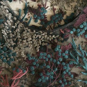Black mesh top with floral embroidered design. Rich wine and indigo tones. Easily dressed up or down!