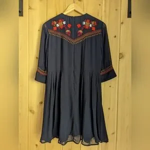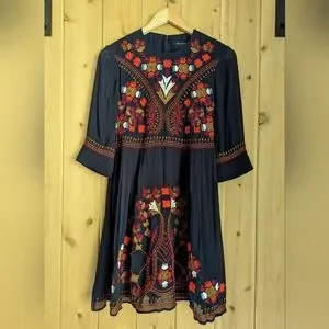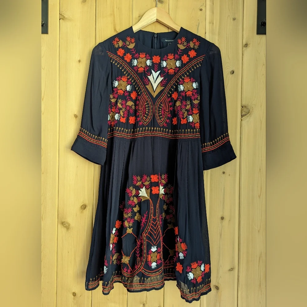 Dress this boho beauty up or down. Gorgeous embroidered details. Structured and flattering fit with a zip up the back and a skirt lining. French Connection, Size XS. 100% Viscose. Perfect Condition.