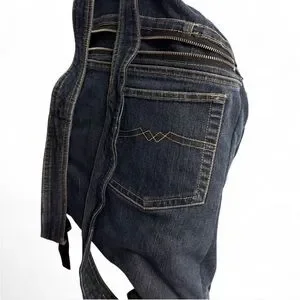 Stylish backpack with vibrant embroidery. Features multicolor floral and abstract designs. A roomy backpack made from salvaged jeans and nostalgic fabric scraps. Strong, structured, and full of texture—it blends utility with vintage soul.