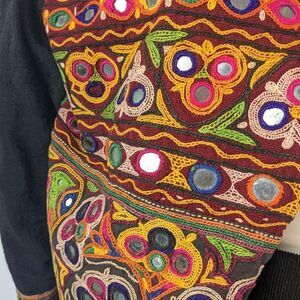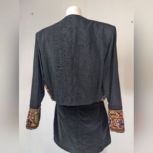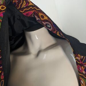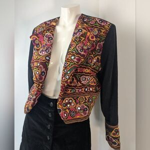 Vibrant embroidered blazer with intricate patterns. Perfect for adding a pop of color to your outfit.